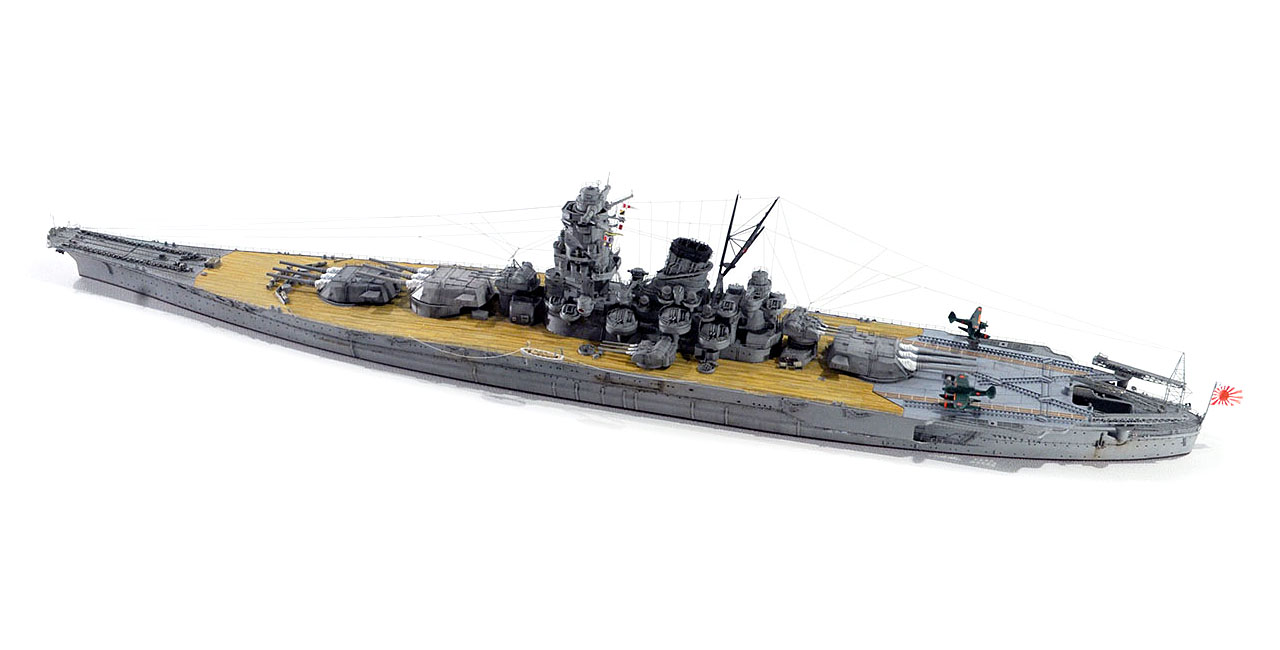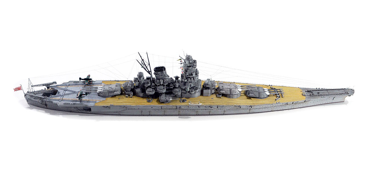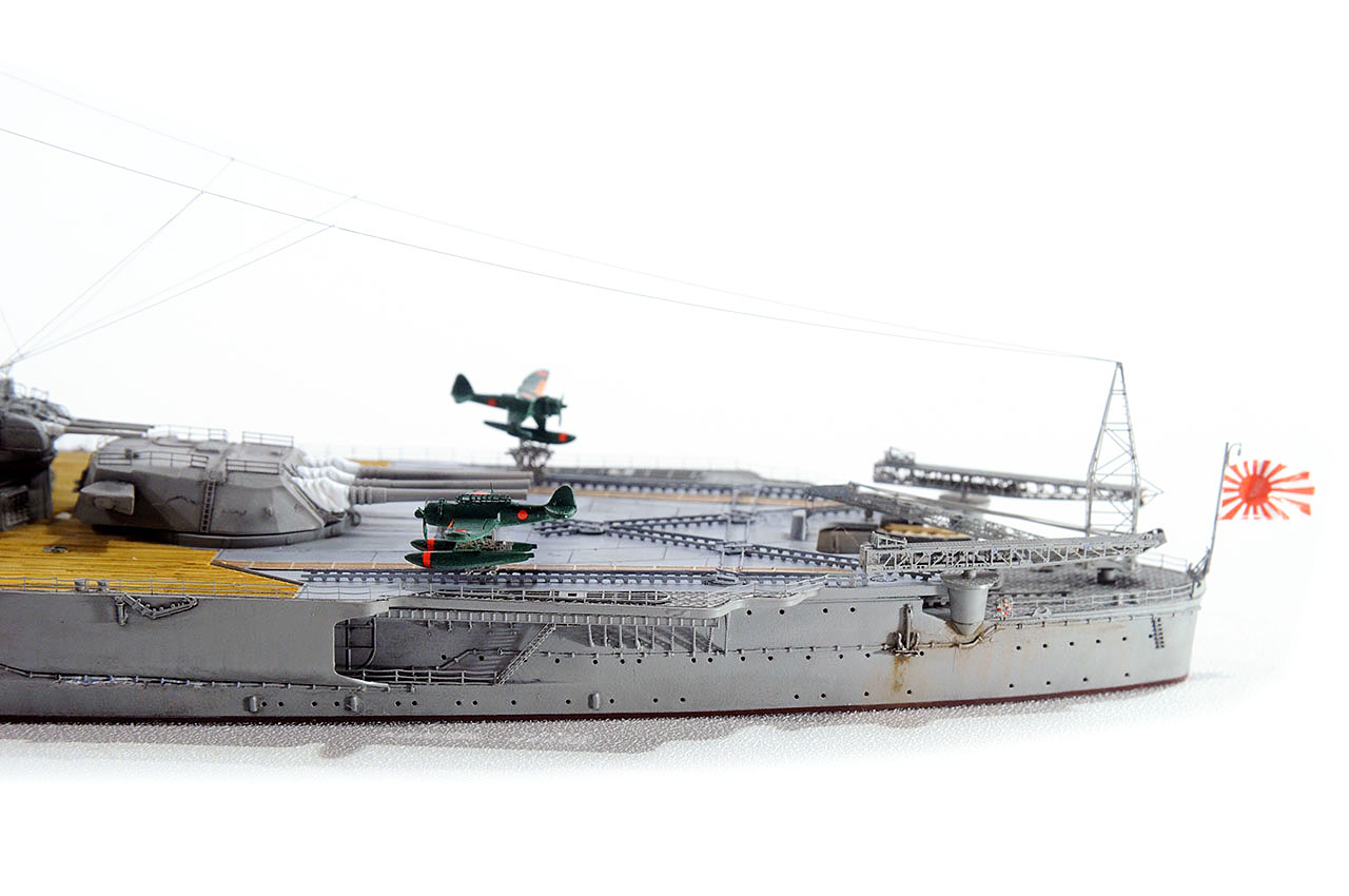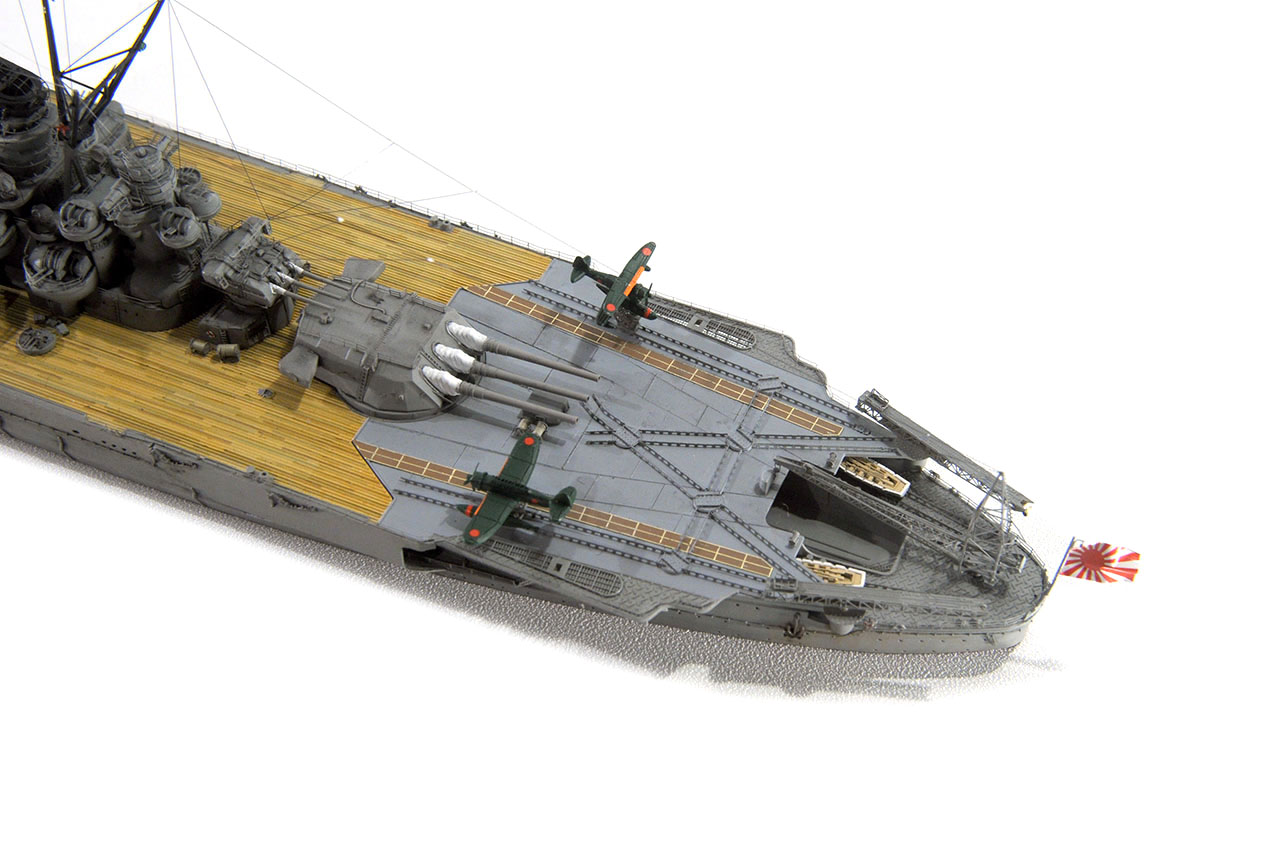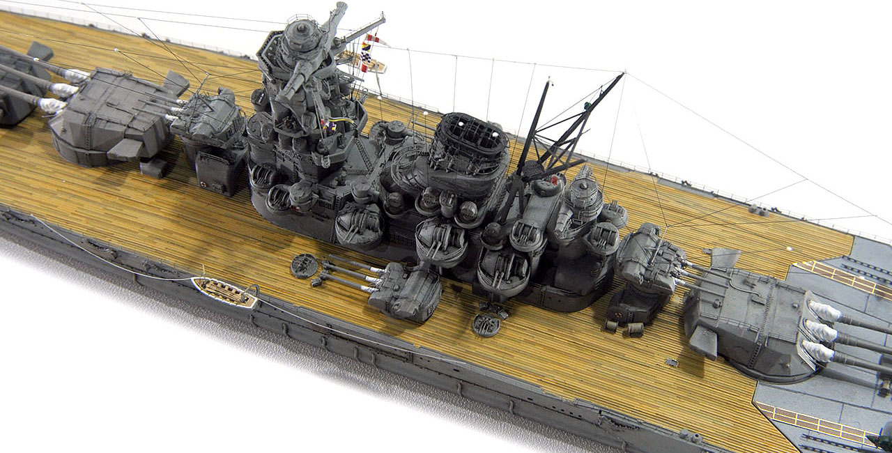 今回の作例設定年代以前ですが、山本五十六長官の棺を武蔵から移した際に、乗艦なさった駆逐艦秋雲元乗組員の方より、甲板はその時点ではまだ通常の木甲板であったコメント頂戴致しました。