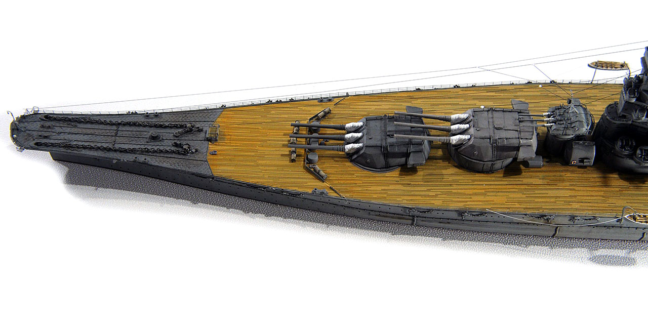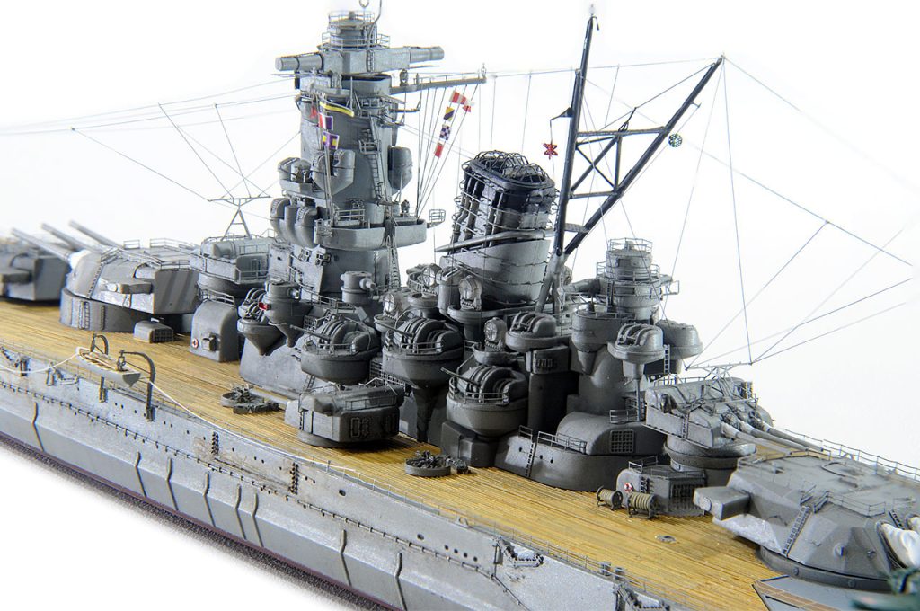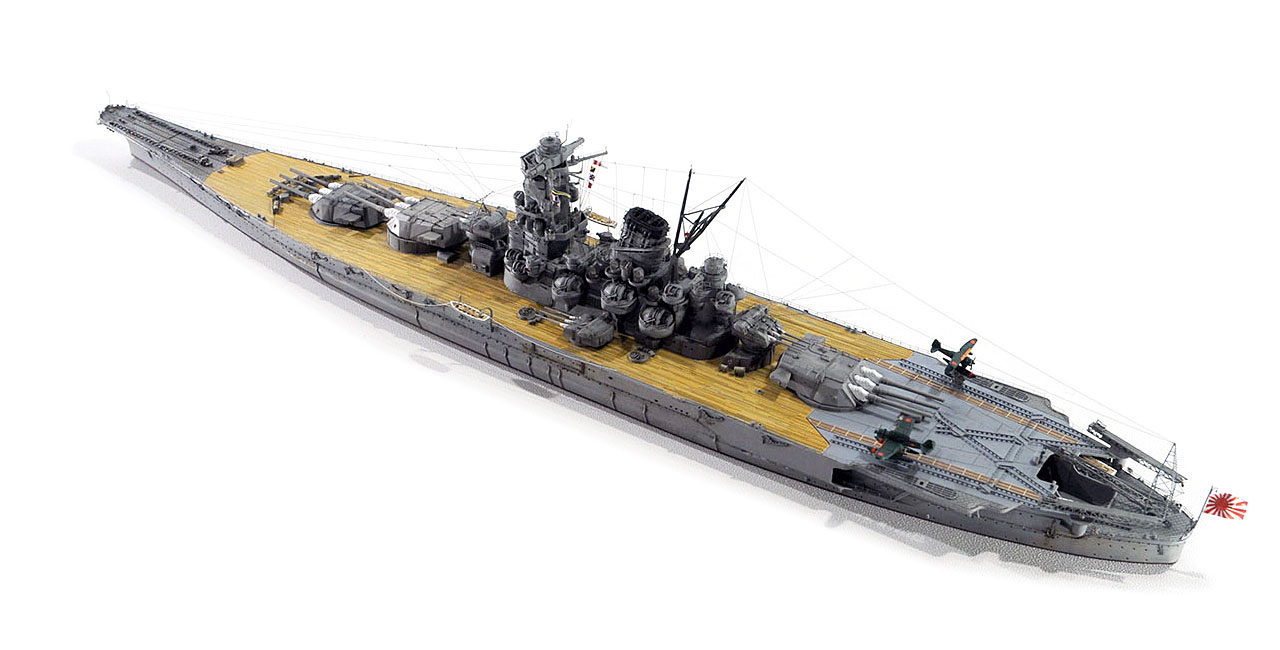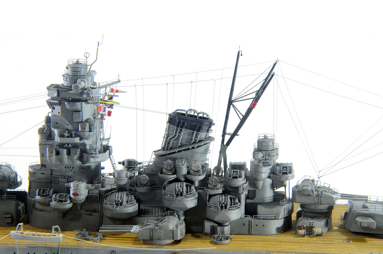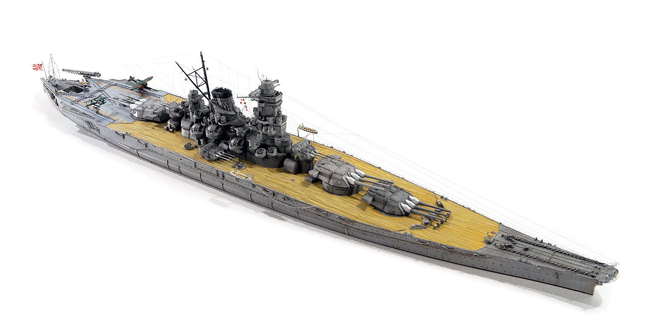 今回の作例設定年代以前ですが、山本五十六長官の棺を武蔵から移した際に、乗艦なさった駆逐艦秋雲元乗組員の方より、甲板はその時点ではまだ通常の木甲板であったコメント頂戴致しました。