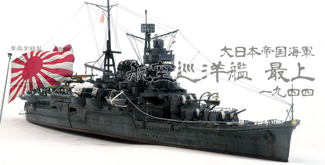 軍艦最上は最上型重巡洋艦(最上型二等巡洋艦)1番艦。 呉海軍工廠にて建造。 艦名は山形県を流れる最上川にちなみ命名された。 『最上』の名を持つ艦としては二隻目。 初代最上は通報艦であった。 当初、最上は主砲として60口径15.5cm3連装砲塔を五基搭載し、軽巡洋艦(二等巡洋艦)として扱われる。 竣工時は二等巡洋艦(軽巡洋艦)だったが、戦争前の改装時に50口径20.3cm連装砲塔五基に置換して一等巡洋艦(重巡洋艦)となる。ただし、書類上は二等巡洋艦のままだった。 太平洋戦争開戦後、最上はミッドウェー海戦で損傷、修理を兼ねて後部主砲二基を撤去し航空巡洋艦に改装された。1944年(昭和19年)10月25日、レイテ沖海戦におけるスリガオ海峡夜戦で大破、雷撃処分された。