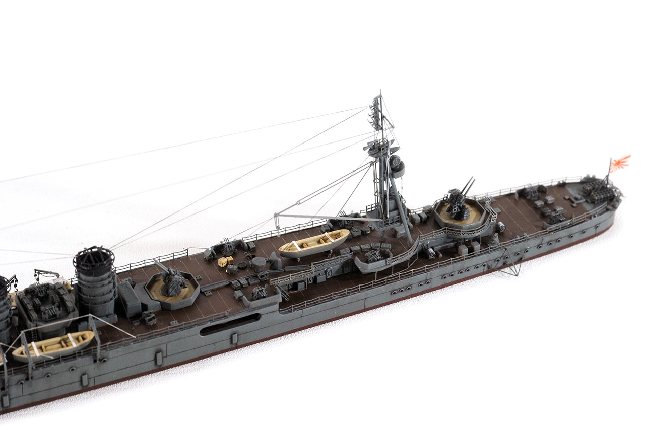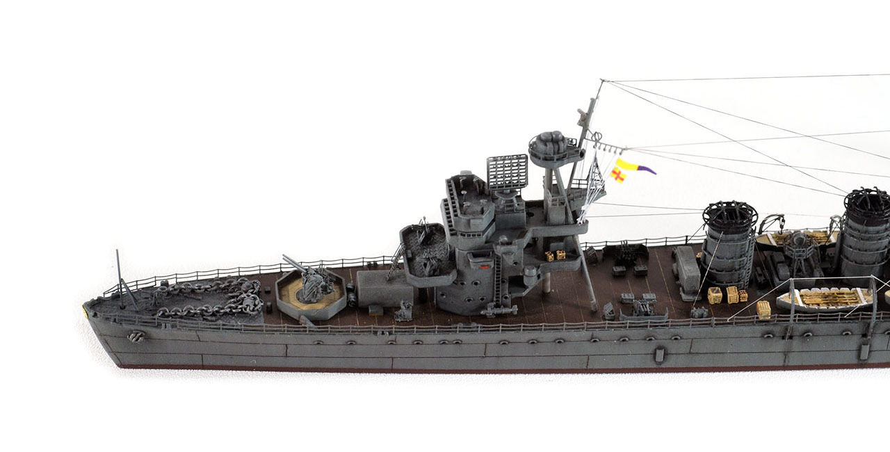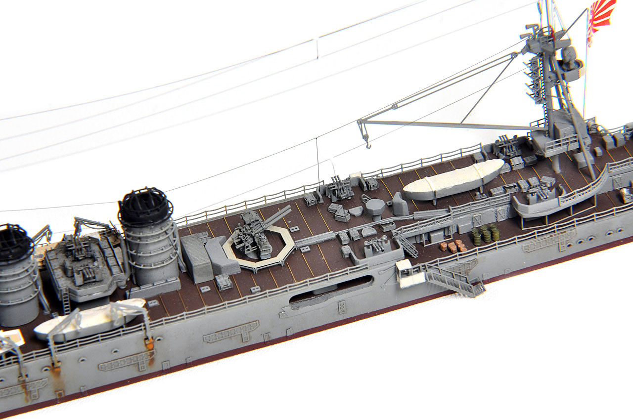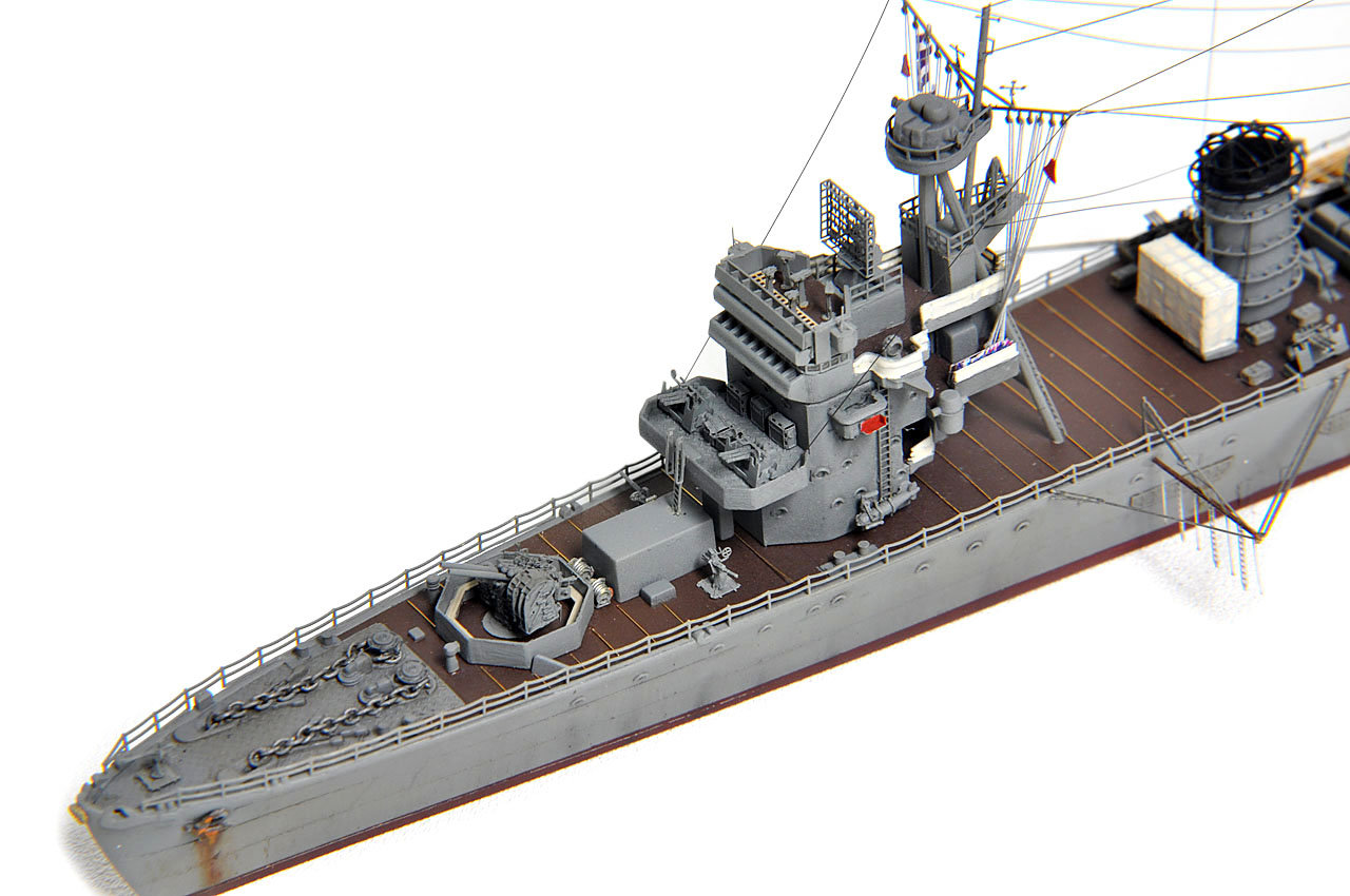 後檣のエッチングに方形のものが用意されているが、(防空巡洋艦改装後公試時写真では方形構造物は確かに確認可能。)レイテ沖海戦時は、ラットライン状のものと、舵柄信号標しか確認出来ないので、実際の写真通りとする。(実艦写真・日本の軍用船)
