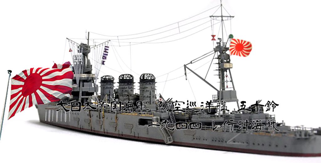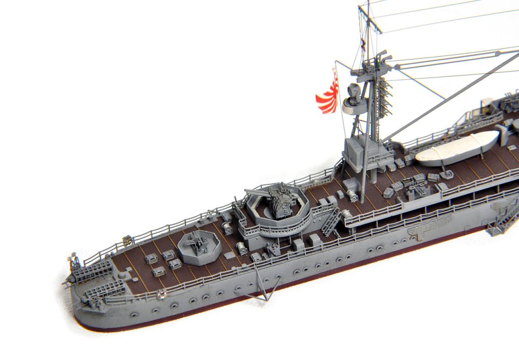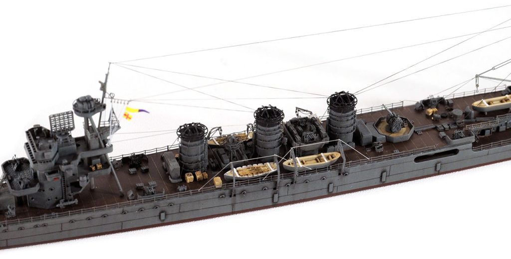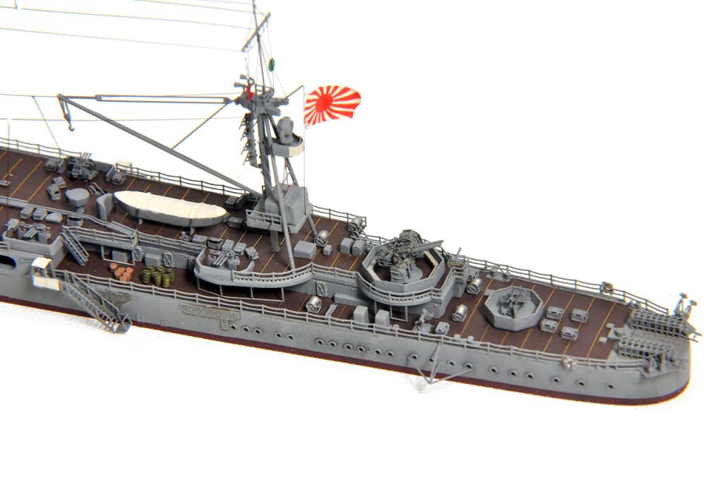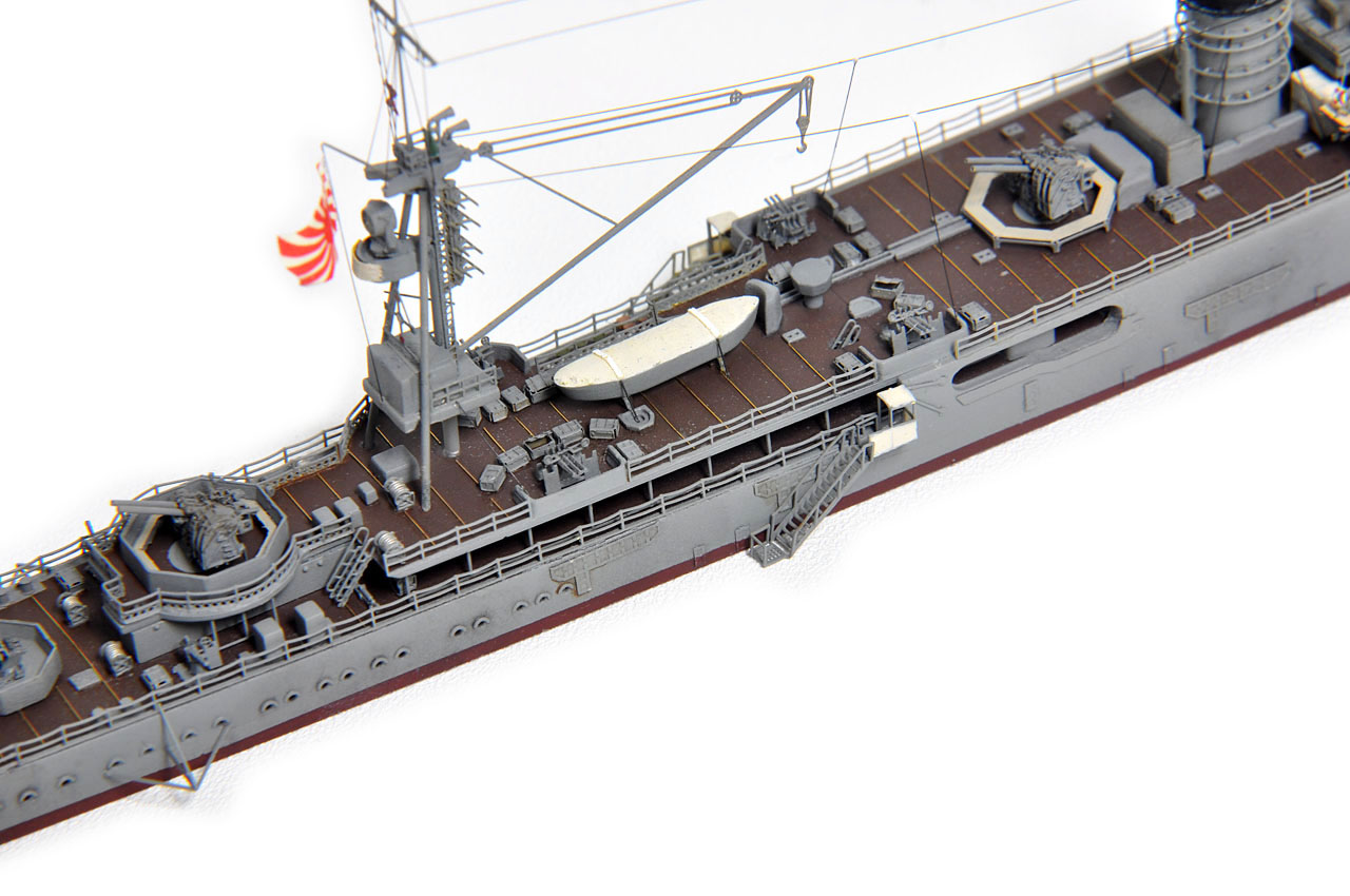 後檣のエッチングに方形のものが用意されているが、(防空巡洋艦改装後公試時写真では方形構造物は確かに確認可能。)レイテ沖海戦時は、ラットライン状のものと、舵柄信号標しか確認出来ないので、実際の写真通りとする。(実艦写真・日本の軍用船)