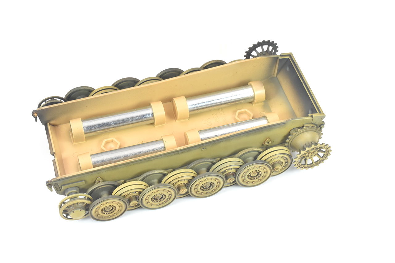 後期型から鋼製転輪(ポルシェティーガーで経験済みのゴムリング板を2枚のプレス鋼板でサンドイッチした構造の大転輪。それまでのゴム縁(ゴムリム)付き転輪と同等の緩衝効果があり、戦略物資であるゴムの節約もできる優れ物だったが、走行音は大きくなった)が採用された。同時に転輪の配置も変更されており、トーションバー・サスペンション方式で、1本のトーションバーに複数の転輪を取り付けるという千鳥足配列(オーバーラップ転輪)は変わっていないが、これより前の型とは配列が異なる。それに伴い転輪の数も、それまで1本のバーに片側3枚ついていた転輪が2枚に減っており、サスペンションの負荷が減る、メンテナンスやトラブル時に外す転輪の数が減る、鉄道輸送用の520 mm幅の履帯(通常は725 mm)を装着する際に、外側の4枚の転輪を外す手間が省ける、コストダウン、生産性向上、といった利点があった。