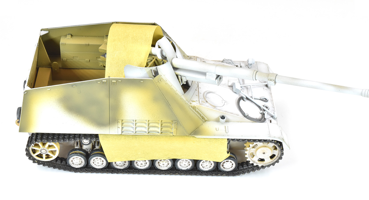 2024/1/27 一通りプラサフ終わったので、地色のデザートイエローを吹いてます。壁面中央辺りは、IPAが飛んで少し凸状態だったので均しました。